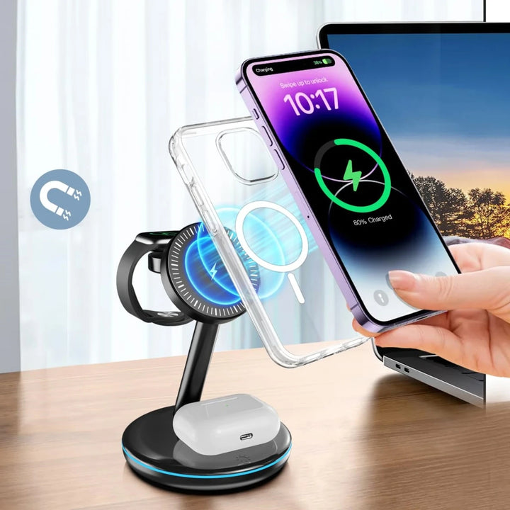 Experience the future of wireless charging with our innovative 3-in-1 Wireless Charger Stand. This sleek and efficient device is designed to simultaneously charge your iPhone, Apple Watch, and AirPods, streamlining your daily routine and decluttering your workspace. You can easily pick up your best product from Vaylishop.